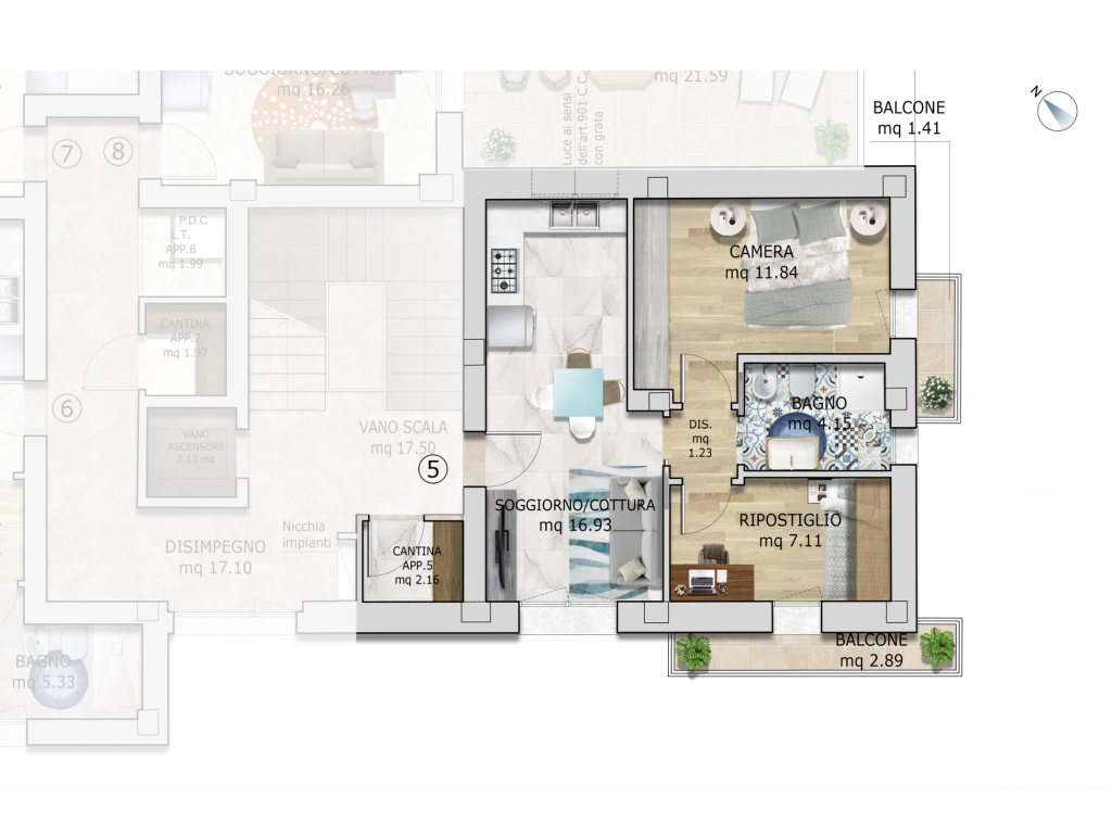 La qualità si vede anche nelle finiture, con gres porcellanato di prima scelta, infissi performanti in PVC, tapparelle elettriche e portoncini blindati di alta sicurezza. Anche gli spazi comuni sono curati: ascensore con fermata al piano garage, predisposizione per fibra ottica, smart home e impianto fotovoltaico condominiale.