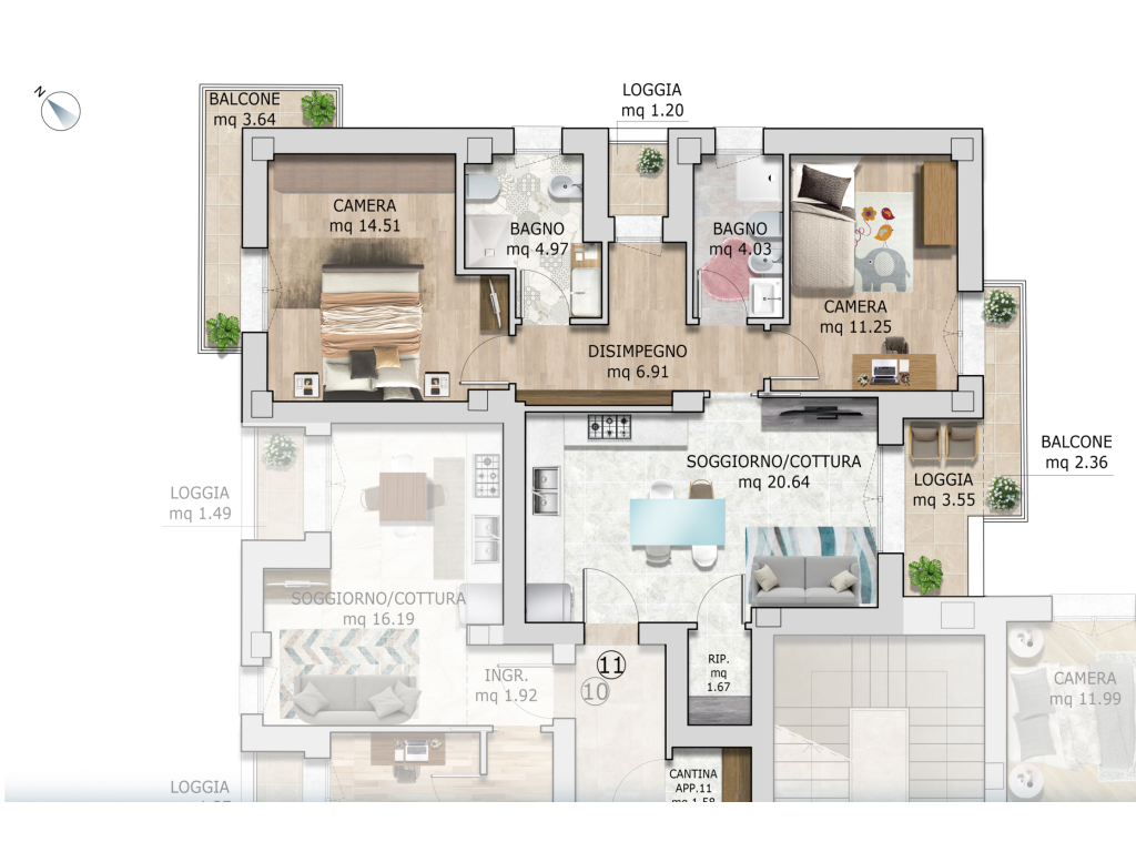 La qualità si vede anche nelle finiture, con gres porcellanato di prima scelta, infissi performanti in PVC, tapparelle elettriche e portoncini blindati di alta sicurezza. Anche gli spazi comuni sono curati: ascensore con fermata al piano garage, predisposizione per fibra ottica, smart home e impianto fotovoltaico condominiale.