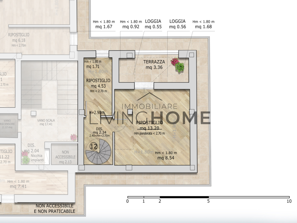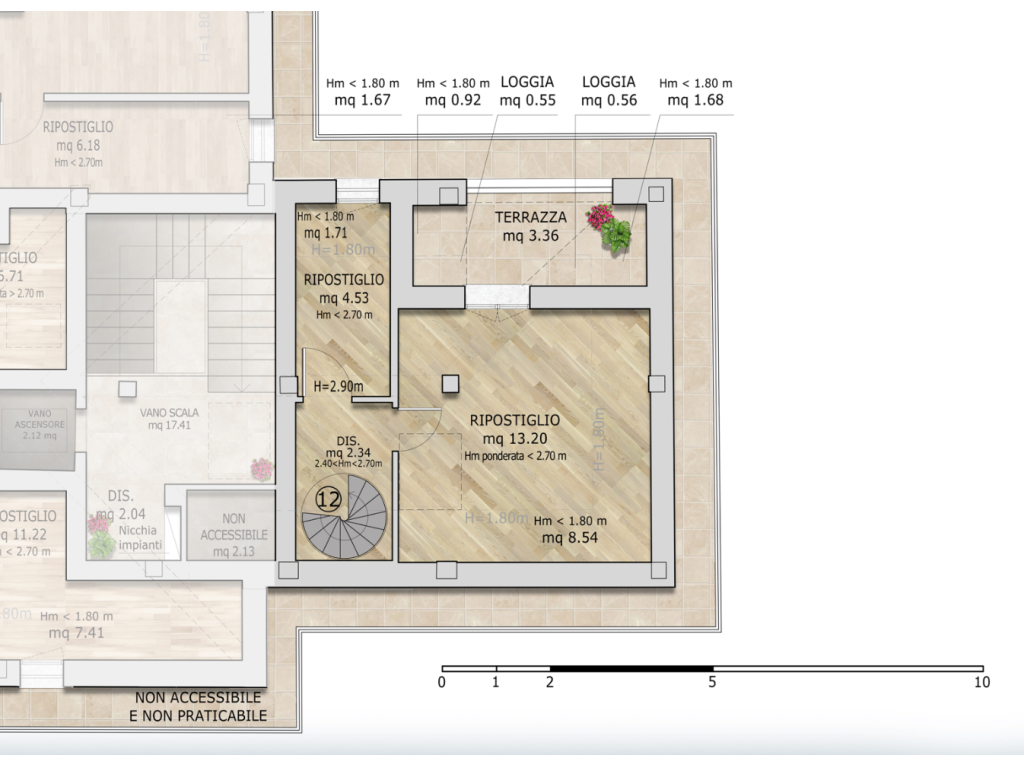 Piano quinto mansardato: Camera da letto - Ripostiglio - Terrazzo