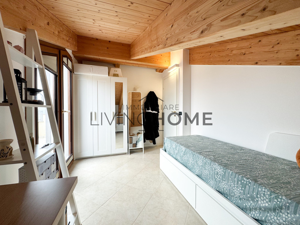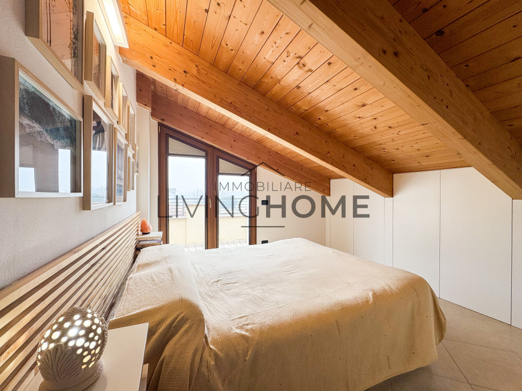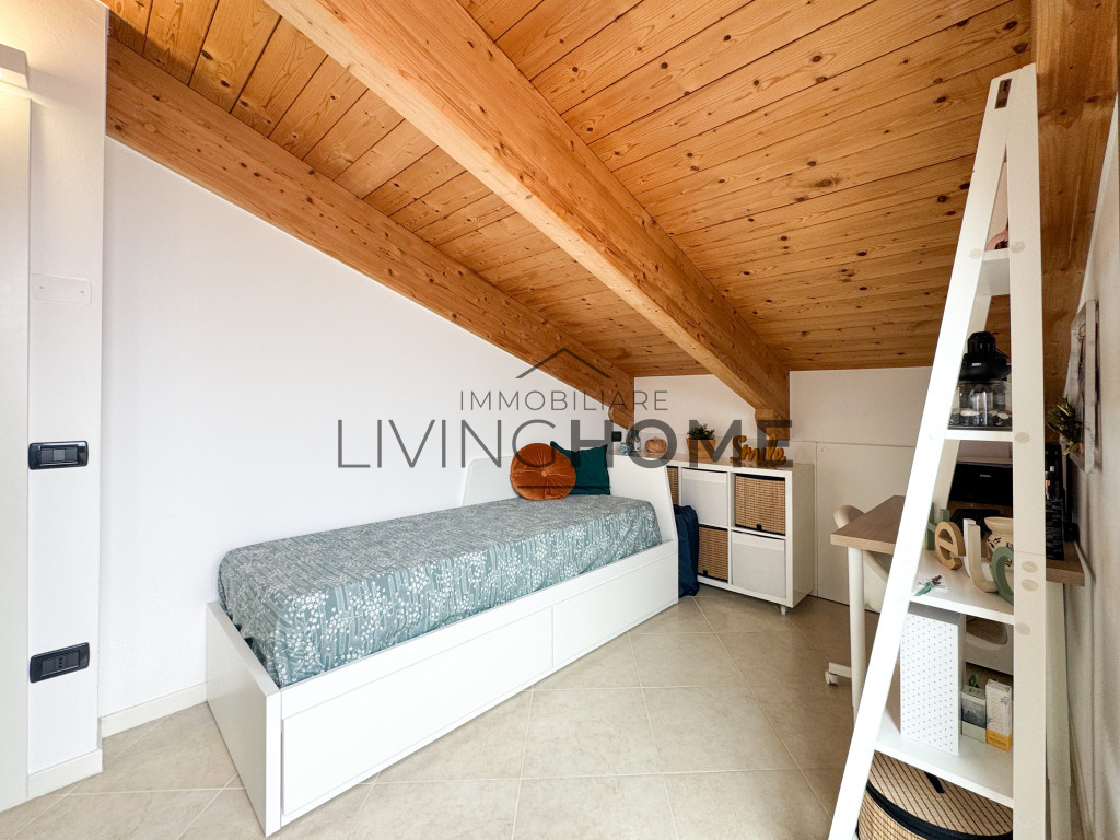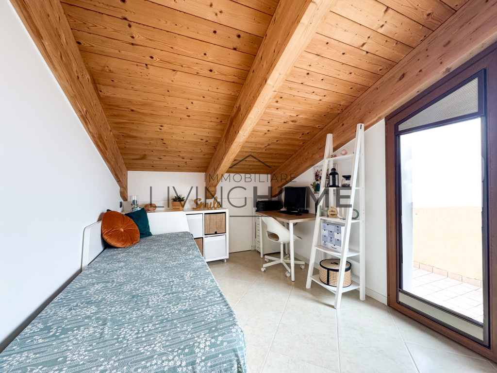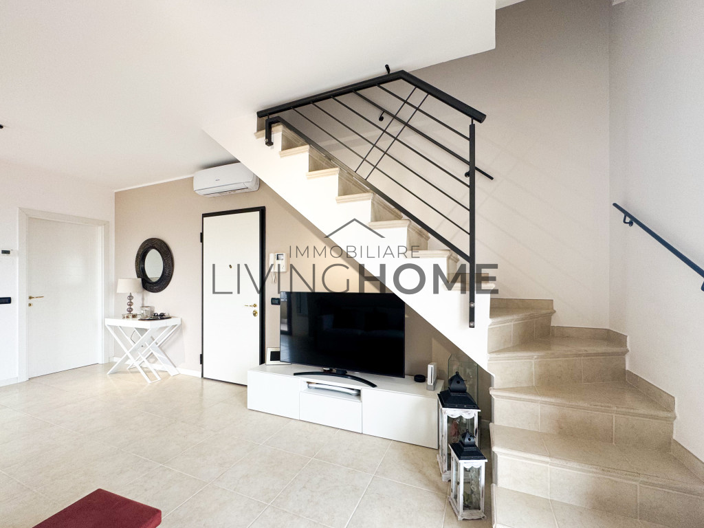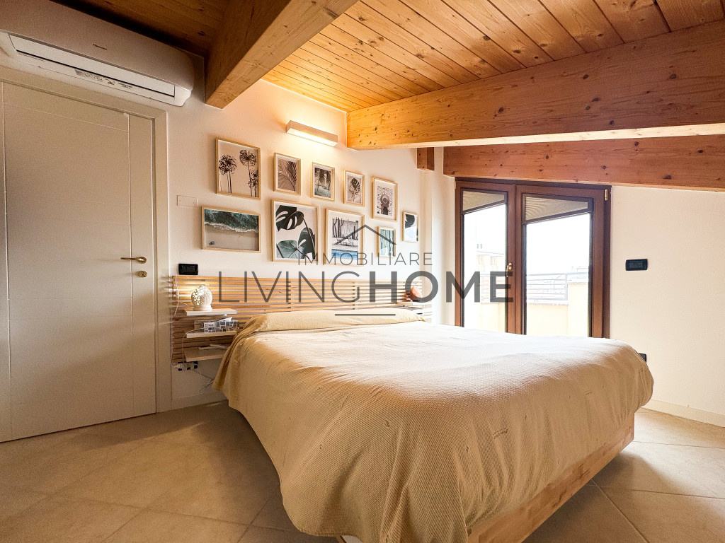 L’appartamento è disposto su due livelli: la zona giorno si sviluppa interamente al primo livello, mentre la zona notte si trova al piano superiore, completamente mansardato ma con altezze che consentono di sfruttare comodamente tutti gli spazi. Questo piano è impreziosito da un ampio terrazzo esposto a Sud-Est, dal quale si può apprezzare una gradevole vista mare.