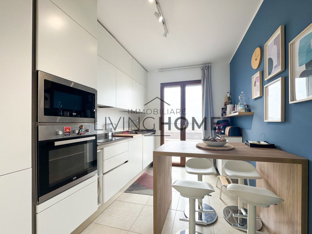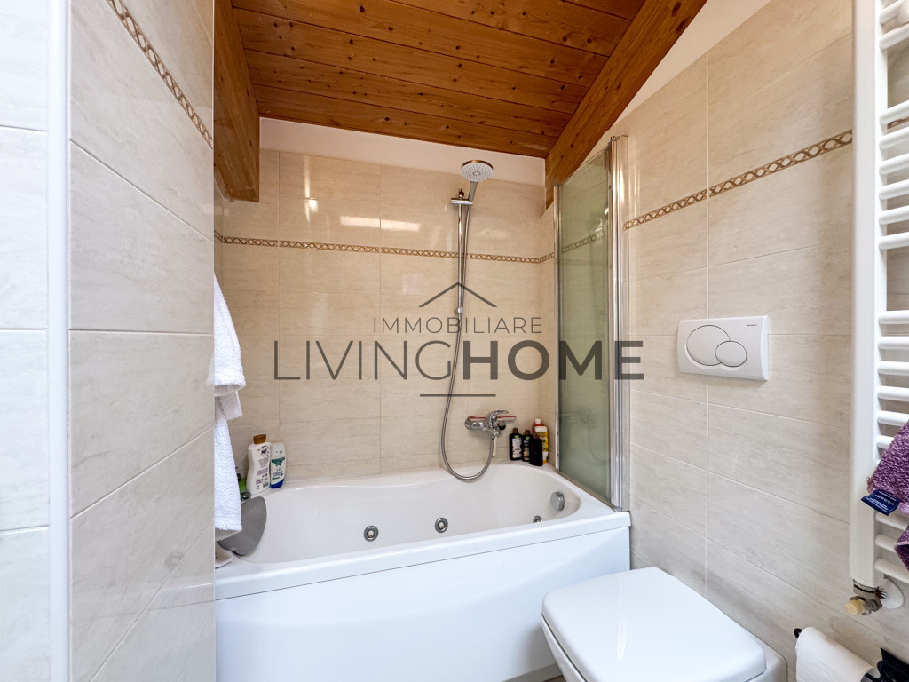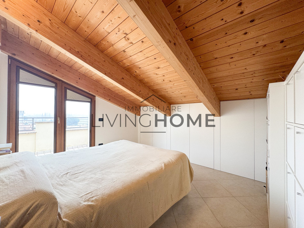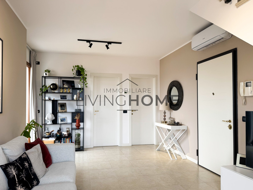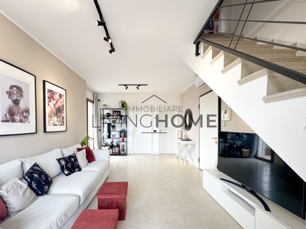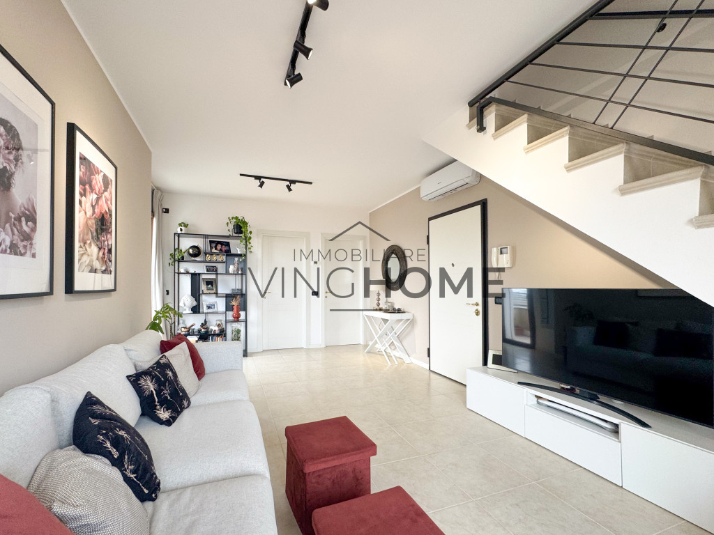 L’appartamento è disposto su due livelli: la zona giorno si sviluppa interamente al primo livello, mentre la zona notte si trova al piano superiore, completamente mansardato ma con altezze che consentono di sfruttare comodamente tutti gli spazi. Questo piano è impreziosito da un ampio terrazzo esposto a Sud-Est, dal quale si può apprezzare una gradevole vista mare.