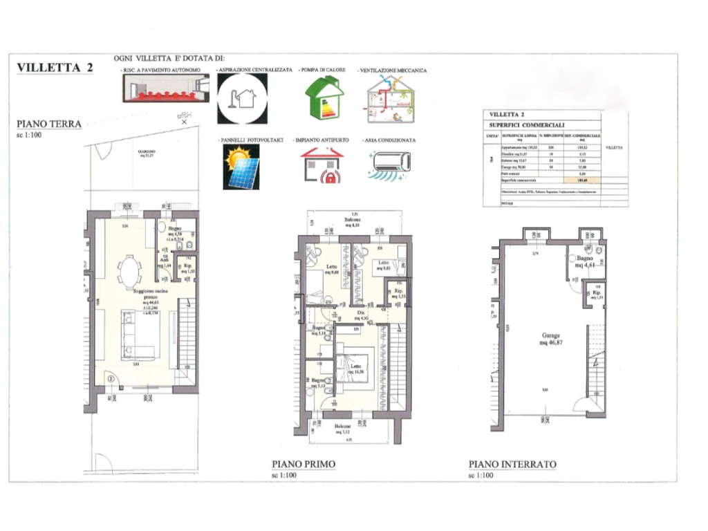 - Piano Interrato: garage di 70 mq, bagno, ripostiglio.
